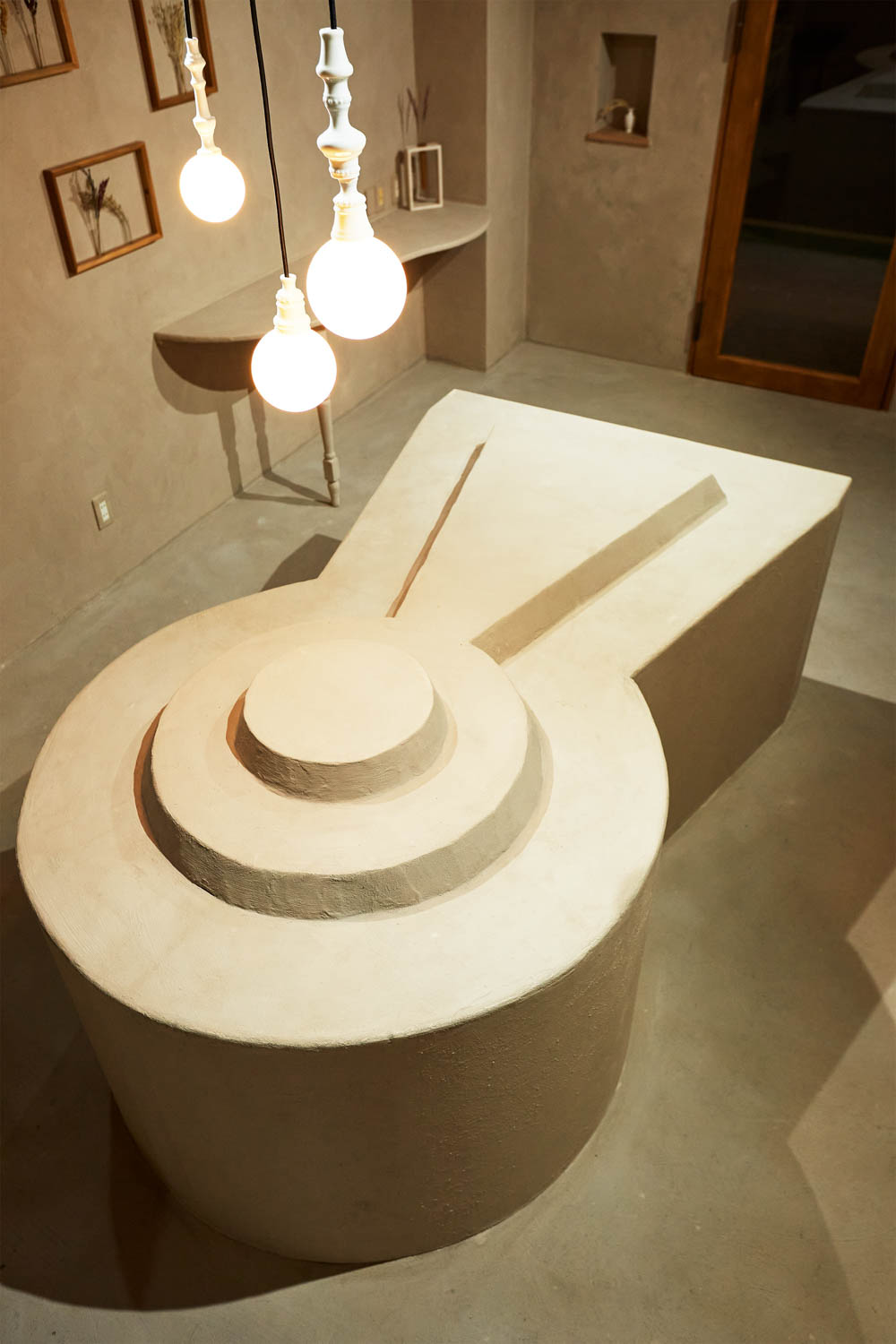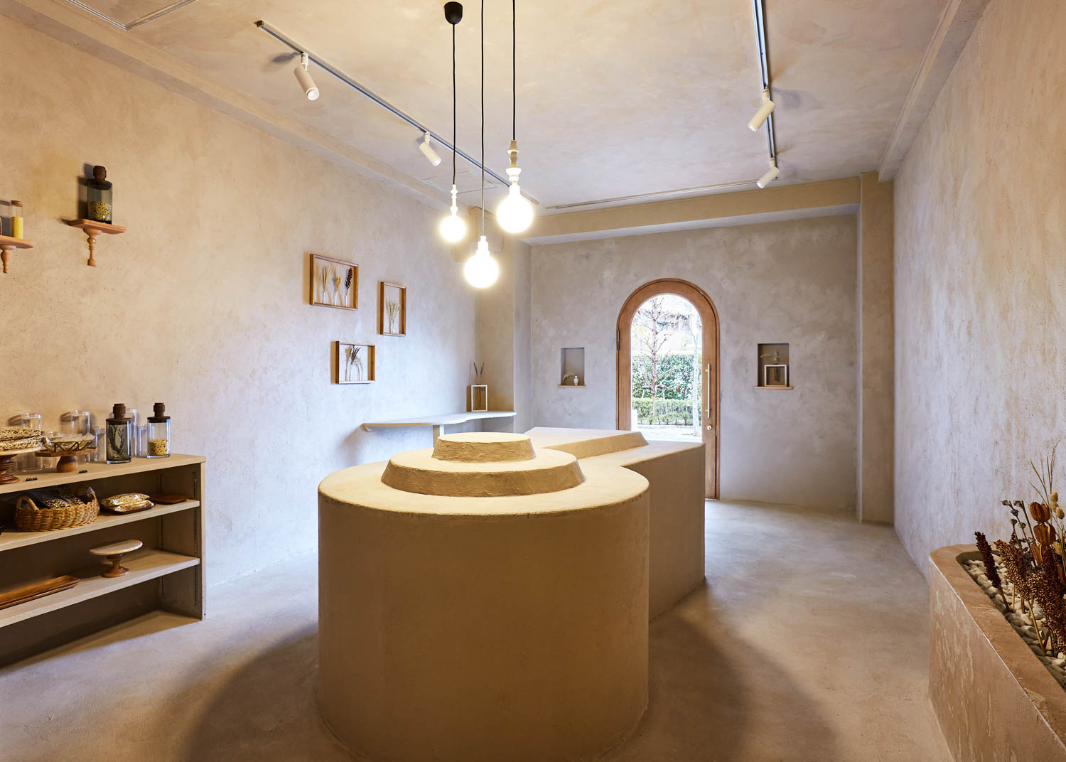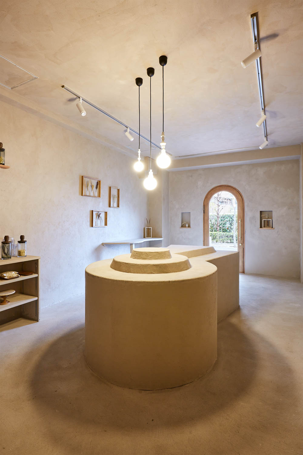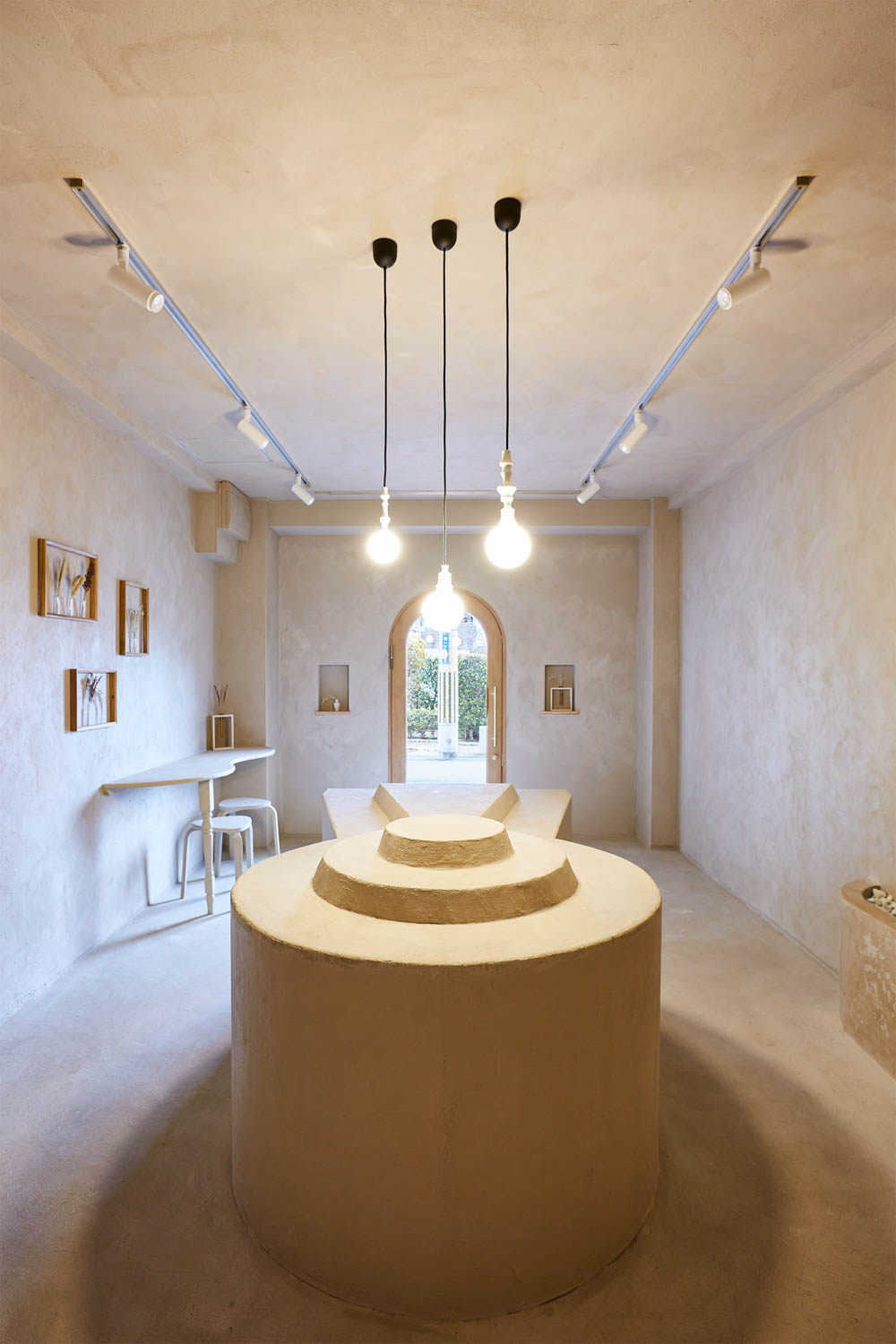 前方後円墳を模した什器を店舗の真ん中に配置。